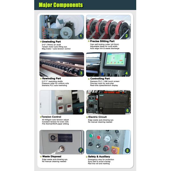 FOCUS thermal paper slitting machine is an advanced solution for slitting thermal paper, NCR paper, fax paper, cash register paper, ATM paper, self-adhesive labels, and other types of paper up to 250gsm. Capable of slitting one, two, or three layers of small rolls, the machine is mostly used for thermal paper and NCR paper. With simple operation and high automation, it’s designed for ease of use. All parameters are pre-set at the factory, requiring only the input of speed and tension for fully automated control.